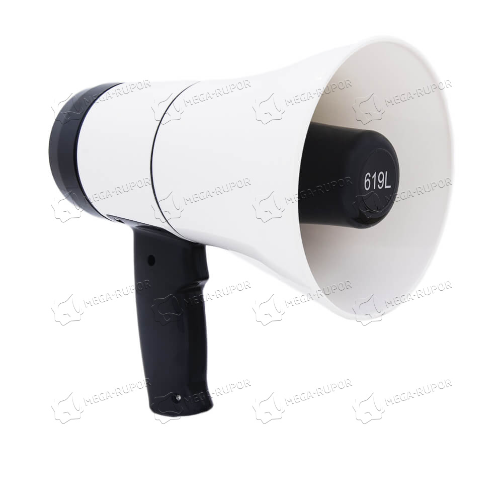 Рупор-громкоговоритель 619L ручного типа предназначен для информирования больших скоплений людей. Прибор выполнен из прочного АБС пластика, оснащен функцией записи речи длиной до 300 секунд. Благодаря мощности в 20 Вт и расстоянию покрытия в 500 метров рупор может использоваться на крупных площадках. Работает от встроенного литиевого аккумулятора емкостью 1500 мАч. На рукоятке есть удобный ремешок для фиксации громкоговорителя на руке. Управление осуществляется с помощью кнопок на задней панели.