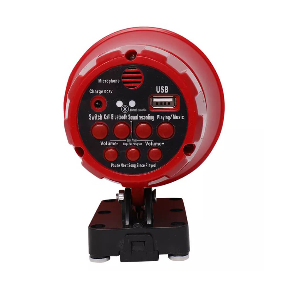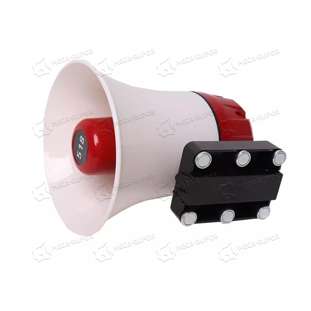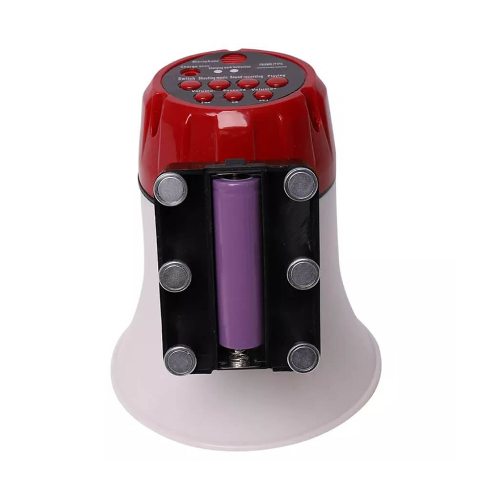 Рупор-громкоговоритель Gong 518B для автомобиля с магнитным креплением используется для речевого оповещения и информирования граждан, а также включения сирены. Уличный громкоговоритель рупорный поддерживает функцию записи голосовых команд длительностью до 300 секунд. Звуковой прибор речевой будет полезен организаторам массовых мероприятий, для экскурсовода, для ораторов, в рекламных целях. Мегафон с микрофоном в машину поддерживает интерфейсы USB / Bluetooth и работает от встроенного аккумулятора. Есть динамик громкоговоритель, через который происходит усиление голоса, на задней части корпуса. Там же расположена панель управления.